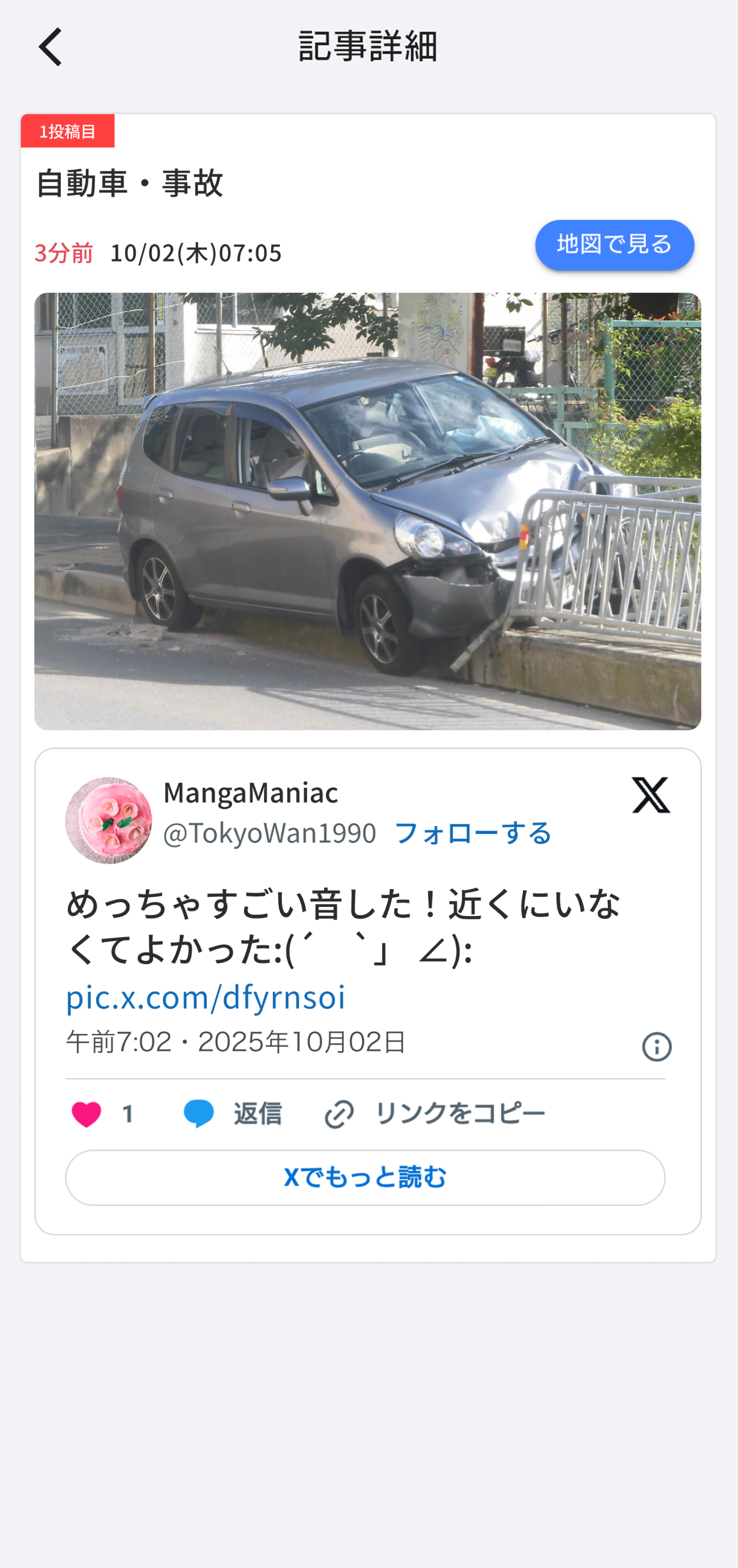 本アプリはSNS上の投稿を収集・表示するものです。 情報の正確性・完全性を保証するものではありません。 緊急時は警察(110番)・消防(119番)へご連絡ください。