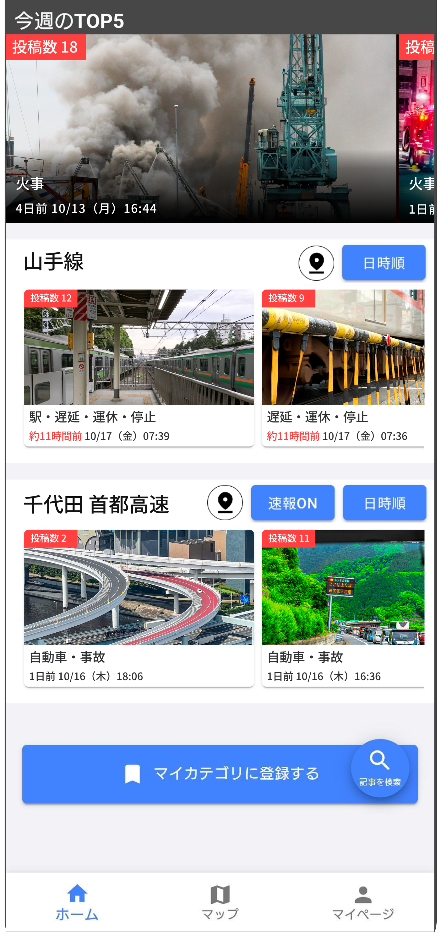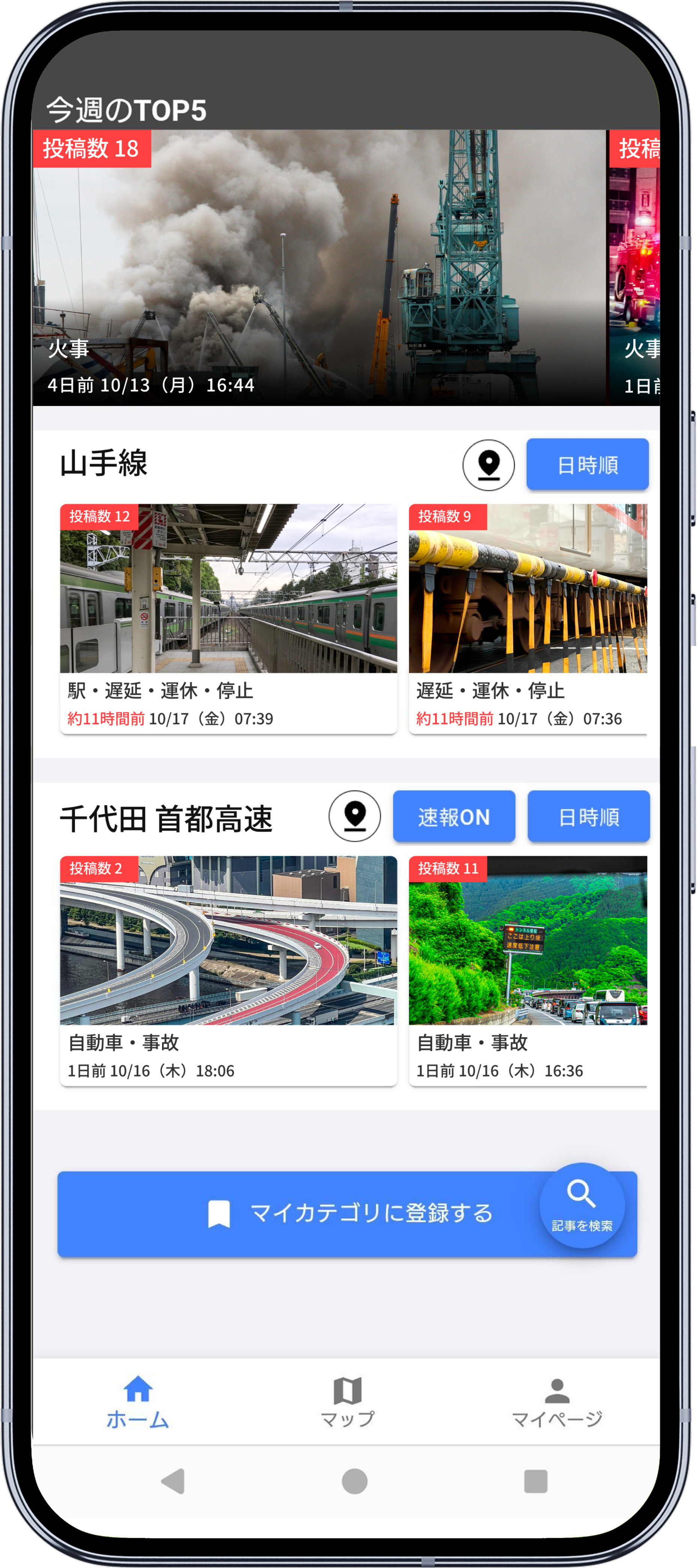 幹線道路・高速道路の名前を登録して渋滞や事故リスクを回避。 現場からの投稿・画像・動画で詳しい状況をチェックできます。