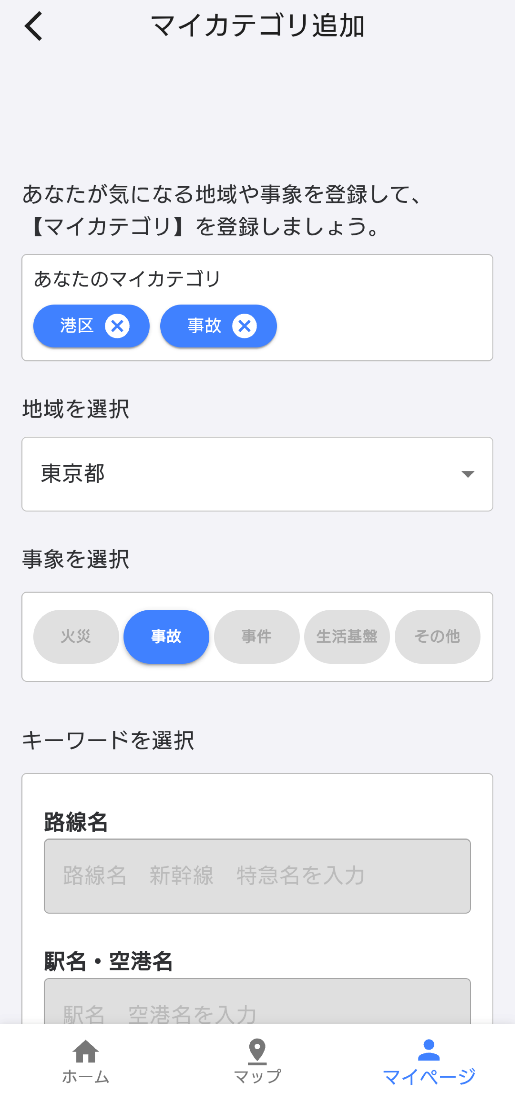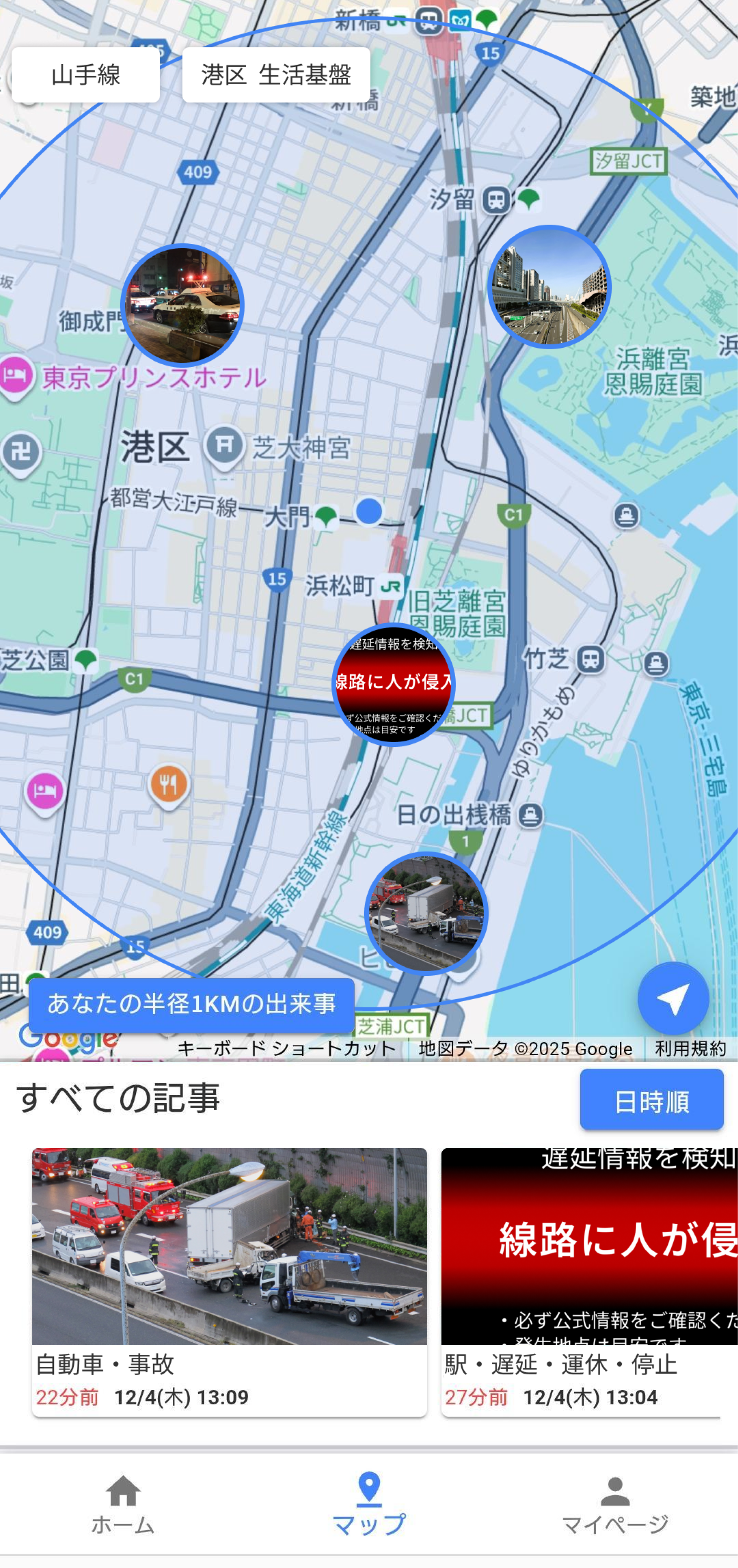 あなたから半径1キロ以内の事件・事故・災害を地図上に表示。 移動中も身の回りの危機情報がひと目でわかります。